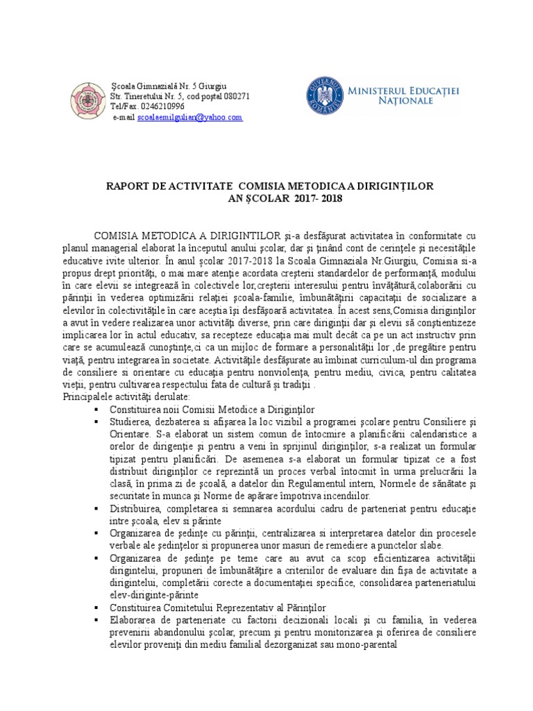 Raport De Activitate Comisia Metodica A Diriginţilor An Scolar