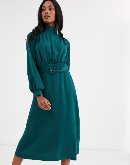 Closet London High Neck Belted Midi Dress In Forest Green Asos